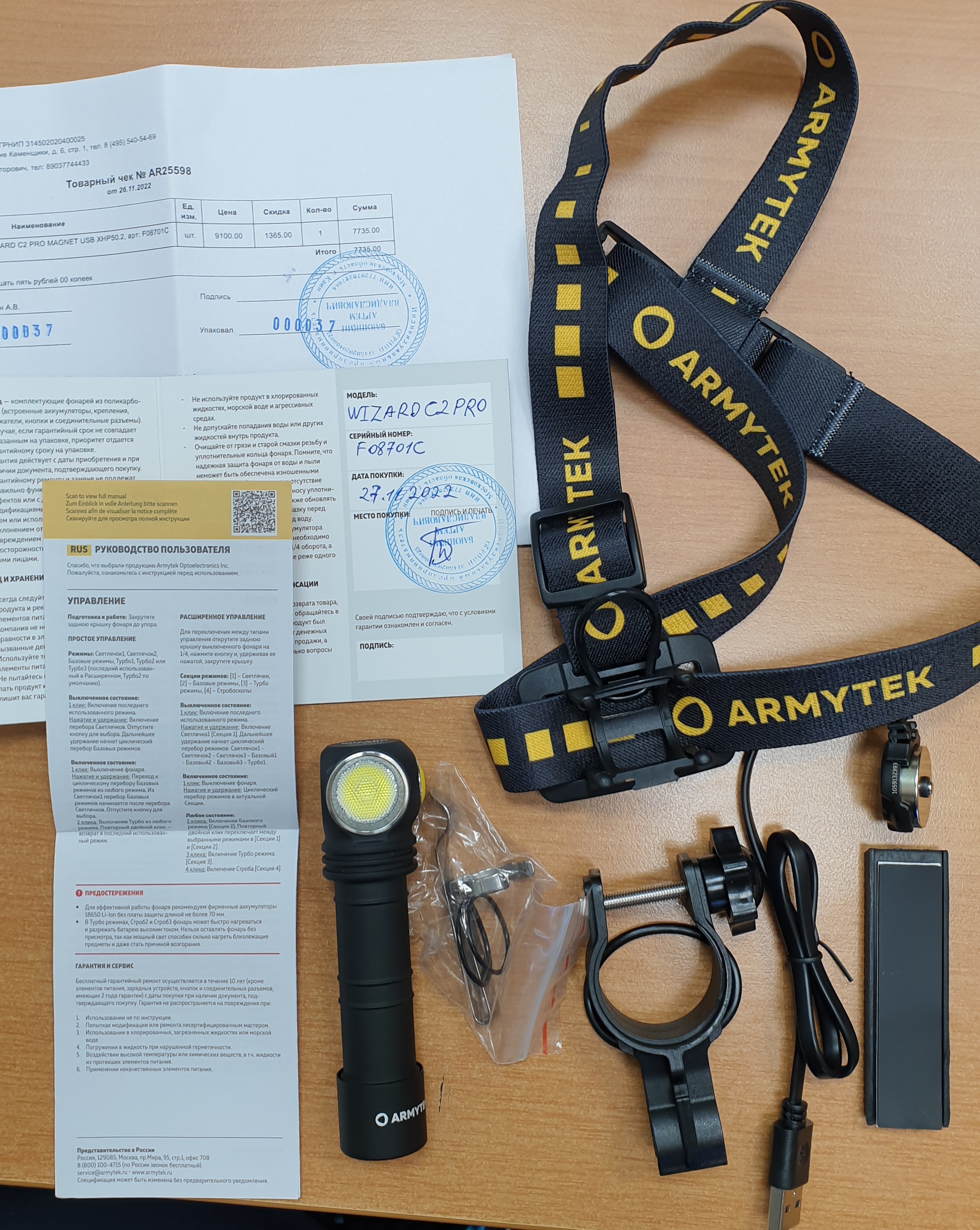 - Аккумулятор 18650 L-lon 3500 мАч - 1 шт; Магнитное USB зарядное устройство - 1 шт; Клипса - 1 шт; Налобное крепление - 1 шт; Велосипедное крепление ABM-01